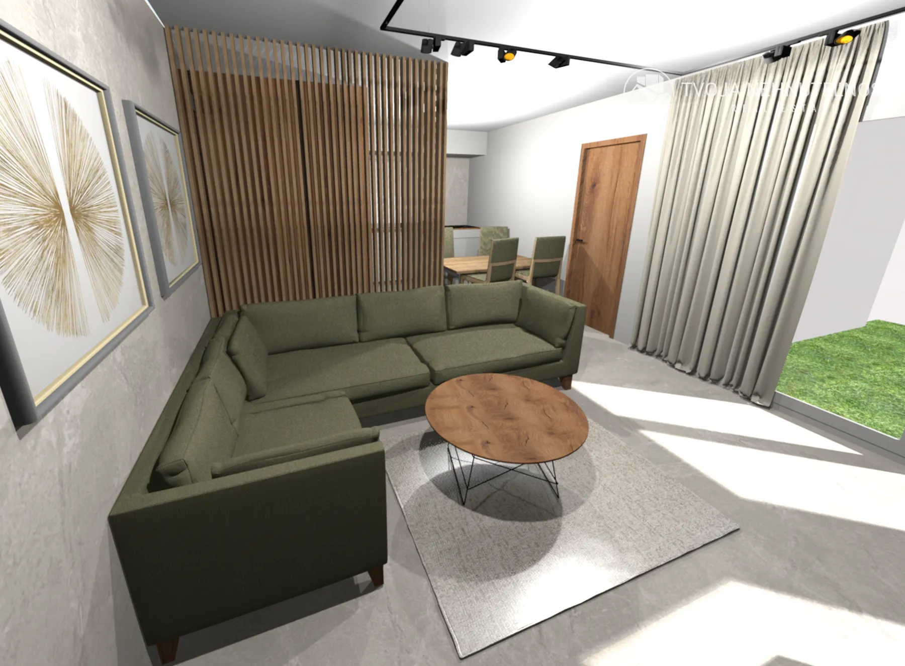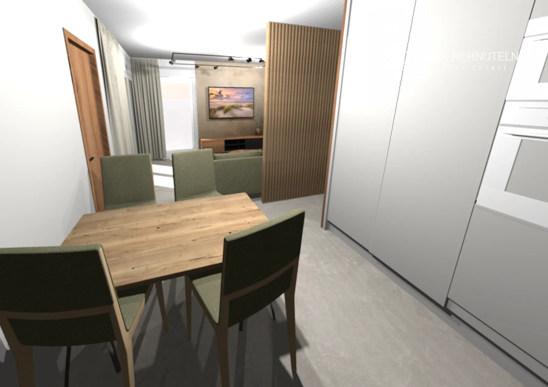 Prestrešený vstup vedie do priestrannej predsiene s premysleným úložným priestorom – miesto pre vstavanú skriňu, botník a vešiakovú stenu. Otvorená koncepcia spája obývaciu izbu s kuchyňou, vytvárajúc svetlý a priestranný celok. Priamy výstup na terasu s výhľadom na zadnú záhradu umožňuje prirodzené prepojenie interiéru s exteriérom. Kuchyňa obsahuje praktickú špajzu pre dodatočné skladovanie.